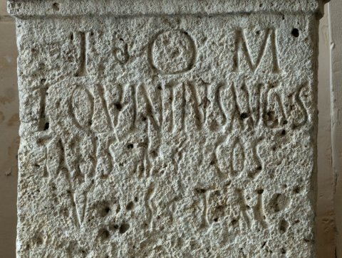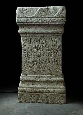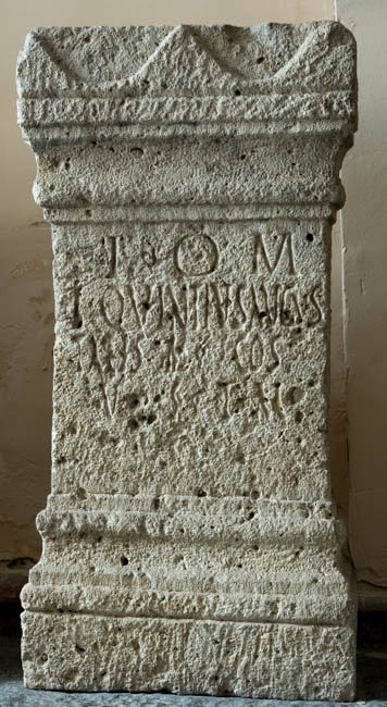 - I(ovi) o(ptimo) m(aximo) / T(itus) Quintius Augus/talis b(ene)f(iciarius) co(n)s(ularis) / v(otum) s(olvit) l(ibens) m(erito)