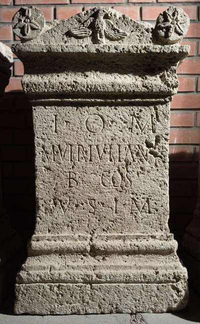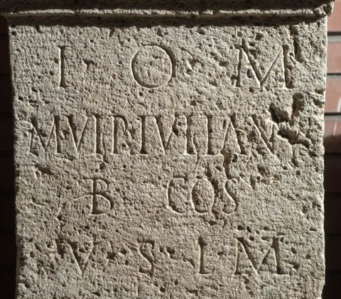 - I(ovi) o(ptimo) m(aximo) / M(arcus) Ulp(ius) Iulianus / b(eneficiarius) co(n)s(ularis) / v(otum) s(olvit) l(ibens) m(erito)