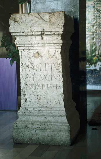 - I(ovi) o(ptimo) m(aximo) / M(arcus) Ulpius / Ulp(ia) Lucius / Ratiaris b(eneficiarius) / co(n)s(ularis) / v(otum) s(olvit) l(ibens) m(erito)