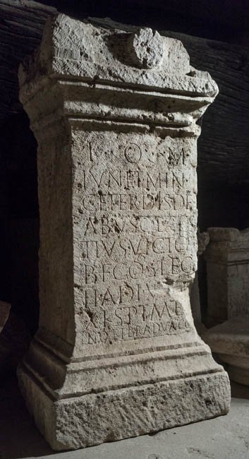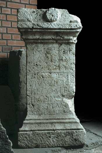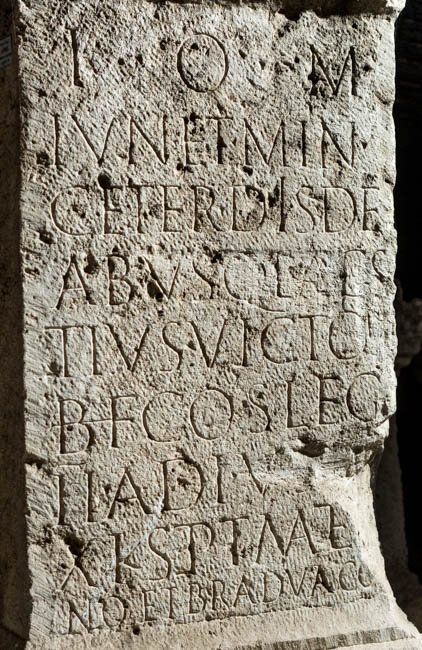 - I(ovi) O(ptimo) M(aximo) / Iun(oni) et Min(ervae) / ceter(is) dis de/abusq(u)e Aces/tius Victor / b(ene)f(iciarius) co(n)s(ularis) leg(ionis) / II Adiu[tric(is)] / X K(alendas) Sept(embres) Mate[r]/no et Bradua co(n)[s(ulibus)]