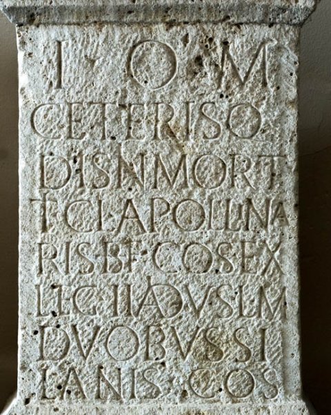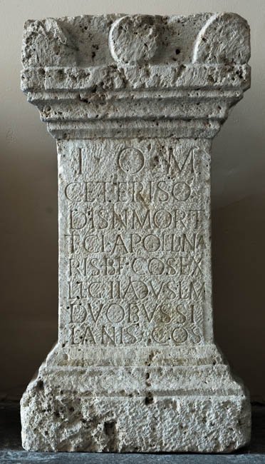 - I(ovi) o(ptimo) m(aximo) / ceterisq(ue) / dis immort(alibus) / Ti(berius) Cl(audius) Apollina/ris b(ene)f(iciarius) co(n)s(ularis) es / leg(ione) II Adi(utrice) v(otum) s(olvit) l(ibens) m(erito) / duobus Si/lanis co(n)s(ulibus)