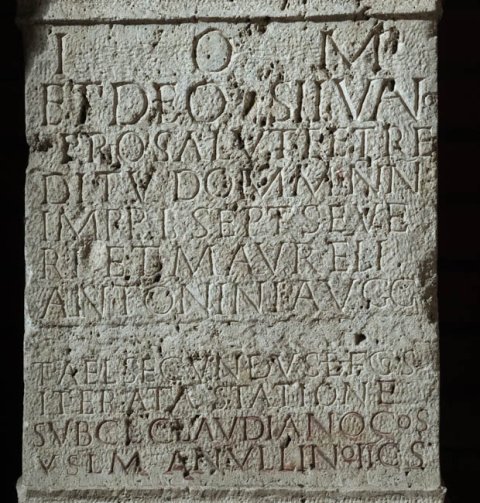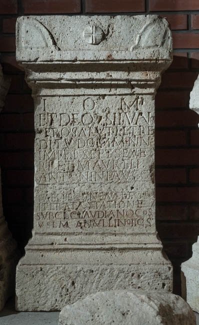 - I(ovi) O(ptimo) M(aximo) / et Deo Silvano / pro salute et re/ditu domm(inorum) nn(ostrorum) / Impp(eratorum) L(uci) Sept(imi) Seve/ri et M(arci) Aureli / Antonini Augg(ustorum) / [[et [L(uci) Sept(imi) Getae Caes(aris)]]] / T(itus) Ael(ius) Secundus b(ene)f(iciarius) co(n)s(ularis) / iterata statione / sub Cl(audio) Claudiano co(n)s(ulare) / v(otum) s(olvit) l(ibens) m(erito) Anullino II co(n)s(ule)