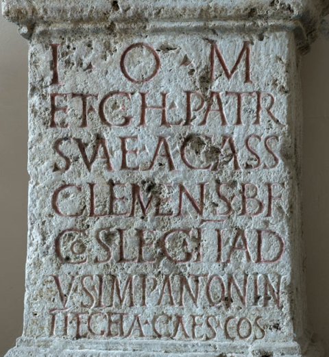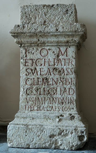 - I(ovi) o(ptimo) m(aximo) / et G(enio) h(uius) l(oci) patr(iae) / suae A(ulus) Cass(ius) / Clemens b(ene)f(iciarius) / co(n)s(ularis) leg(ionis) II Ad(iutricis) / v(otum) s(olvit) Imp(eratore) Antonin(o) / II et Geta Caes(are) co(n)s(ulibus)