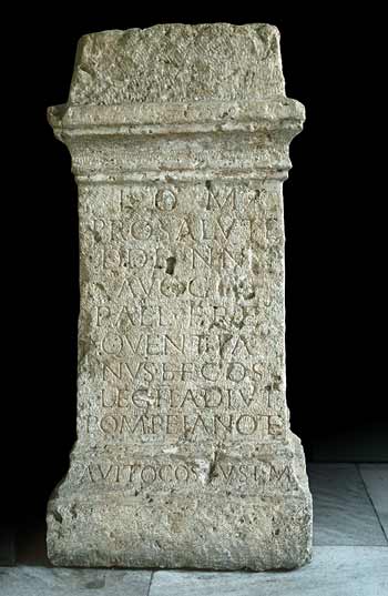 - I(ovi) O(ptimo) M(aximo) / pro salute / ddd(ominorum) nn[[n]](ostrorum) / Augg[[g]](ustorum) / P(ublius) Ael(ius) Fre/quentia/nus b(ene)f(iciarius) co(n)s(ularis) / leg(ionis) II Adiut(ricis) / Pompeiano et // Avito co(n)s(ulibus) v(otum) so(lvit) l(ibens) m(erito)