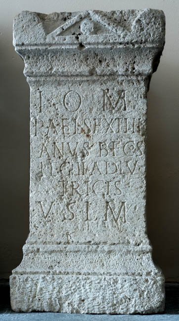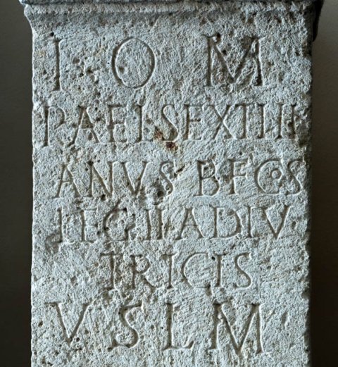 - I(ovi) o(ptimo) m(aximo) / P(ublius) Ael(ius) Sextili/anus b(ene)f(iciarius co(n)s(ularis) / leg(ionis) II Adiu/tricis / v(otum) s(ovit) l(ibens) m(erito)