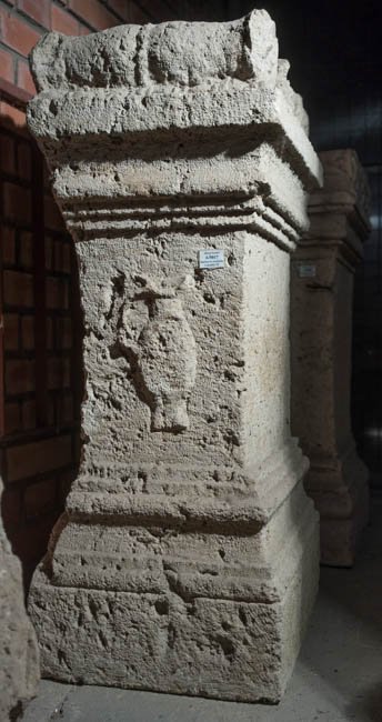 - Volutenpolster (pulvini) mit Rosetten, dazwischen Palmetten, darunter Perlstab. Auf den Nebenseiten Gefäße: links Opferschale (patera), rechts Kanne.