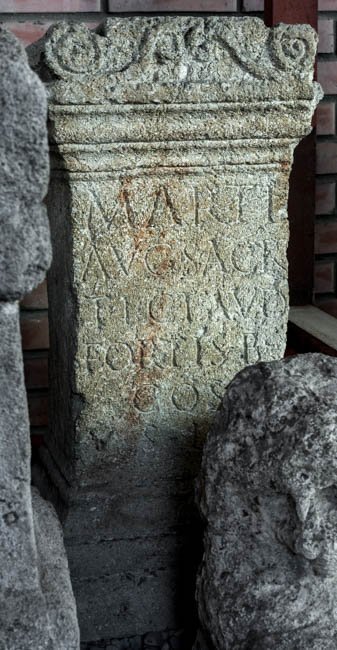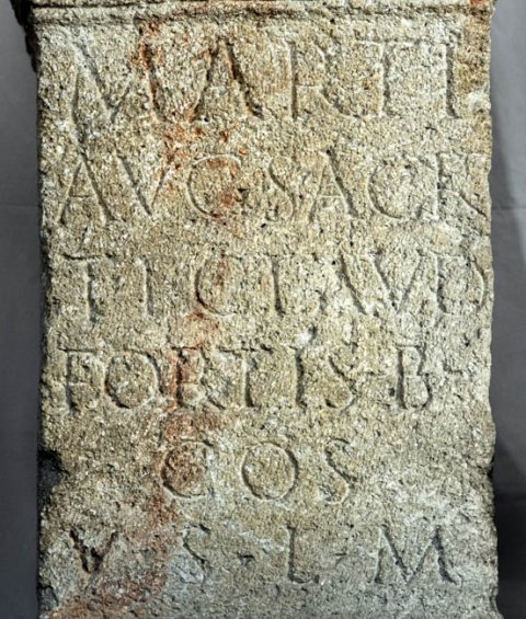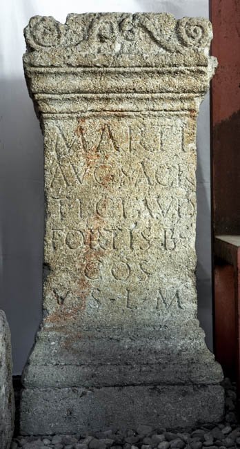 - Marti / Aug(usto) sacr(um) / Ti(berius) Claud(ius) / Fortis b(eneficiarius) / co(n)s(ularis) / v(otum) s(olvit) l(ibens) m(erito)