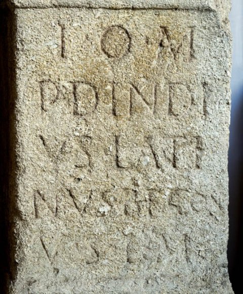 - I(ovi) o(ptimo) m(aximo) / P(ublius) Dindi/us Lati/nus b(ene)f(iciarius) co(n)s(ularis) / v(otum) s(olvit) l(ibens) m(erito)