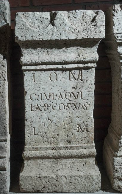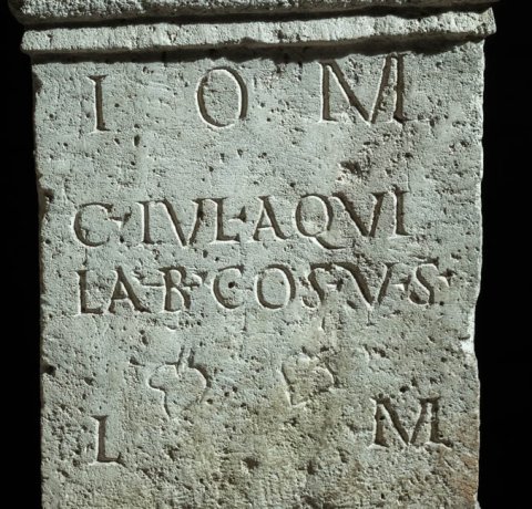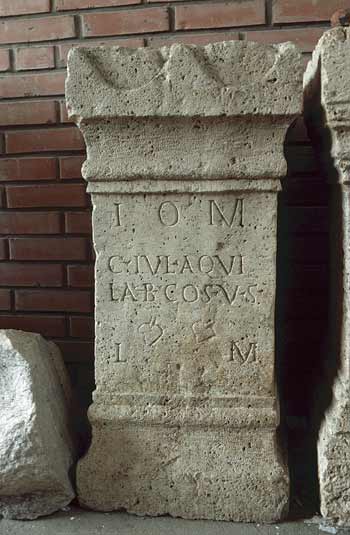 - I(ovi) o(ptimo) m(aximo) / C(aius) Iul(ius) Aqui/la b(eneficiarius) co(n)s(ularis) v(otum) s(olvit) / l(ibens) m(erito)
