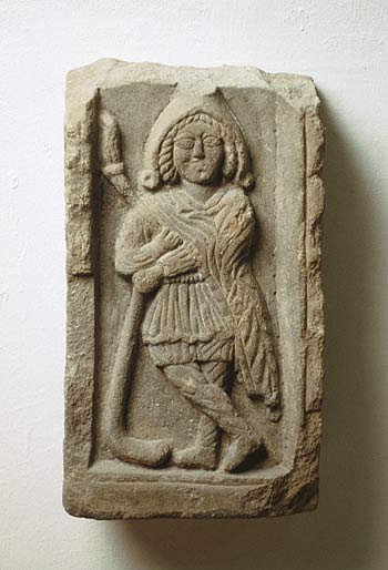 - Mythische Figur : in gerahmtem Rechteckfeld stehender Cautes in orientalischer Tracht (Hosen, kurzes, gegürtetes Ärmelgewand, Mantel, phrygische Mütze), Beine gekreuzt, auf Pedum gestützt, in der Rechten erhobene Fackel. Rechts schloss vermutlich weiteres Relieffeld (Tauroktonie ?) an.