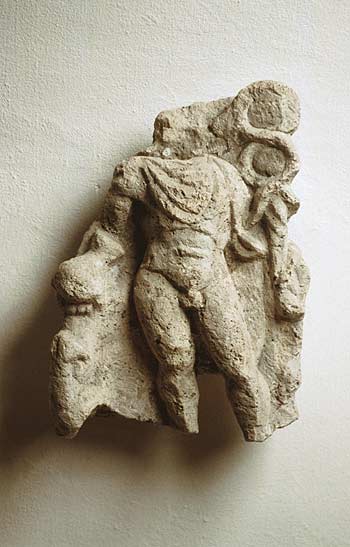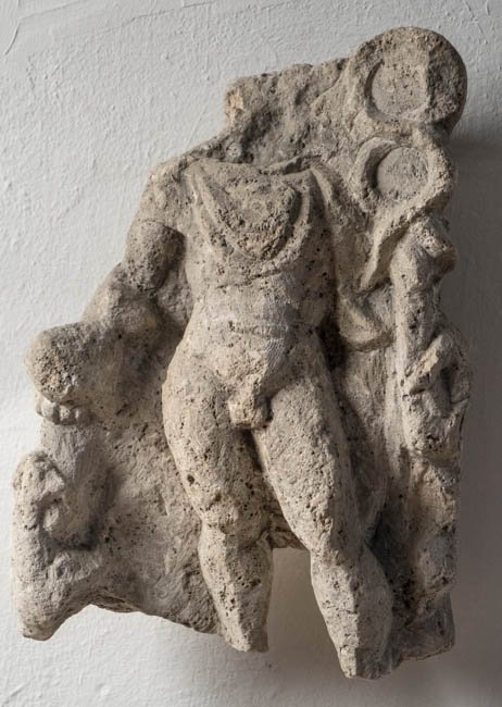 - Mythische Figur : stehender Mercur, nackt bis auf den auf der rechten Schulter befestigten Mantel, im linken Arm Heroldsstab (caduceus), in der Rechten Geldbeutel, darunter Altar, vor diesem Widder.