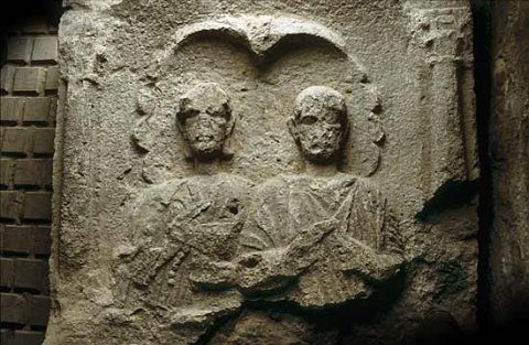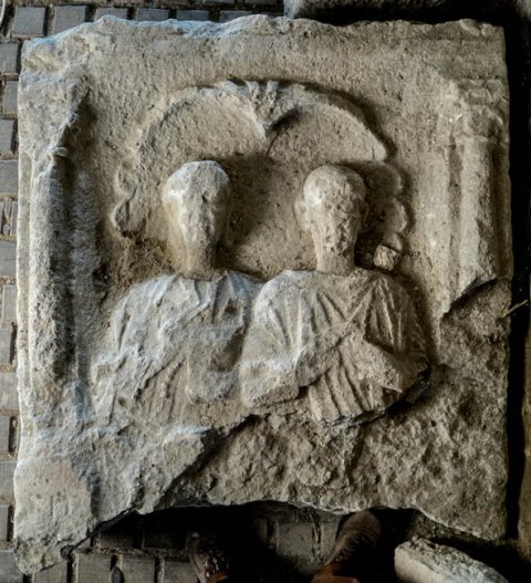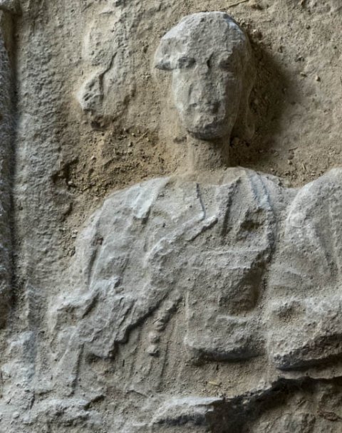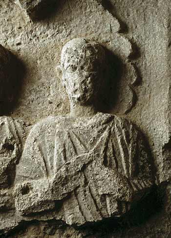 Im Hauptbild zwischen Säulen große Muschel, davor zwei Halbfiguren (Ehepaar). Links Frau: Ärmeltunica, Mantel, in der Linken offenes Kästchen, aus dem eine Kette hängt. Rechts Mann: bärtig, kurzes Haar, Sagum mit Fransen, in der Linken Rolle (volumen).