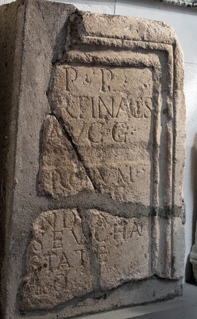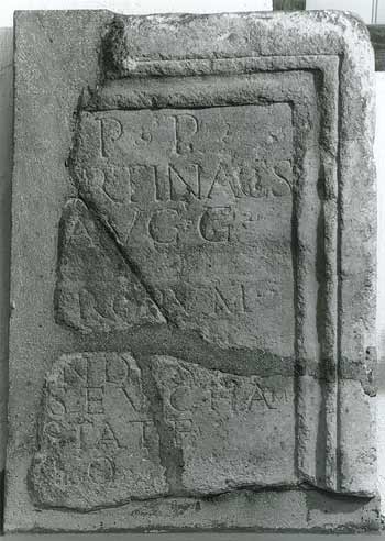- [--- Im]pp(eratorum) / [Caess(arum) L(uci) Septimi Severi Pe]rtinacis / [et M(arci) Aureli Antonini Pii] Augg(ustorum) / [[et L(uci) Septimi Getae nob(ilissimi) Caes(aris)]] / [et Iuliae Aug(ustae) matris Aug(usti) et cas]trorum / [---]ndus / [--- pro]seucham / [--- vetu]state / [corruptam sumptu suo a so]lo / [restituendam? curavit?
