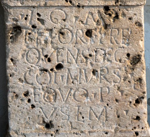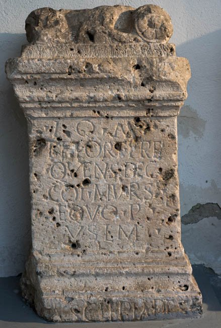 - I(ovi) o(ptimo) m(aximo) / T(itus) Hort(ensius) Fre/quens dec(urio) / col(oniae) Murs(ensium) equo p(ublico) / v(otum) s(olvit) l(ibens) m(erito) // Asclepiades f(ecit)