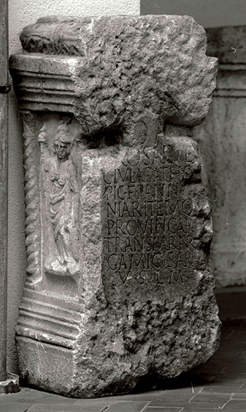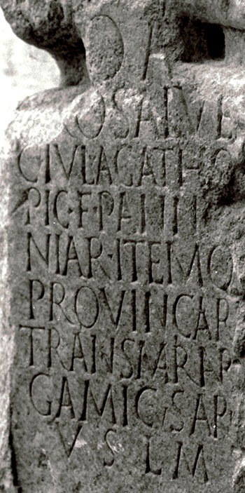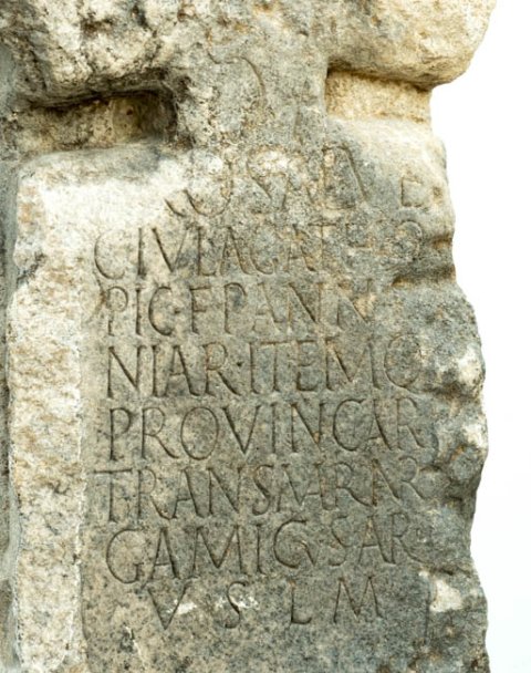 - I(ovi) o(ptimo) m(aximo) / pro salute / C(ai) Iul(ii) Agatho/pi c(onductoris) f(errariarum) Panno/niar(um) itemq(ue) / provinciar(um) / transmarinar(um) / Gamicus ark(arius) / v(otum) s(olvit l(ibens) m(erito)