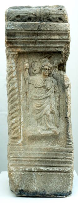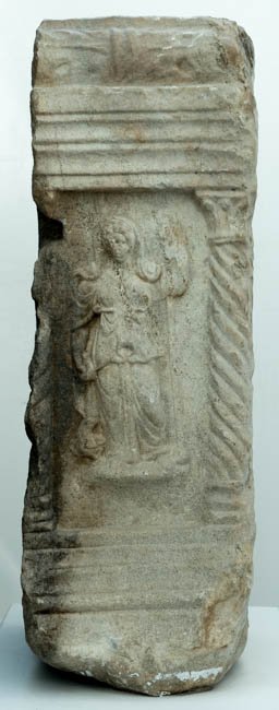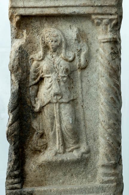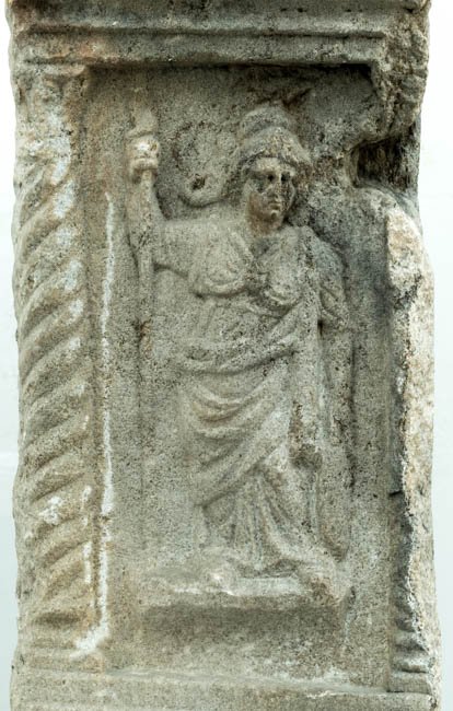 Auf den Nebenseiten auf Podest stehende mythische Figuren zwischen Säulen mit Spiralkanneluren. Links Minerva: gegürteter Chiton, Mantel, Helm, Ägis, in der Rechten Lanze.