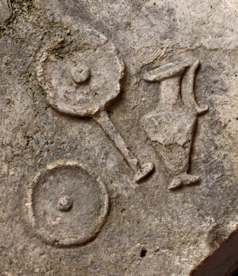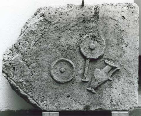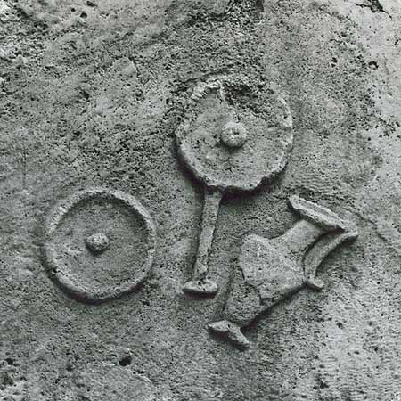 - Ungerahmtes Bildfeld, darin Gefäße: Omphalosschale ohne Griff, Omphalosschale mit Stielgriff, Kanne.