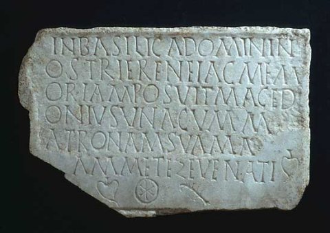 - In basilica Domini n/ostri Ereneias mem/oriam posuit Maced/onius una cum matronam suam A/ammete evenati / (Christogramm)