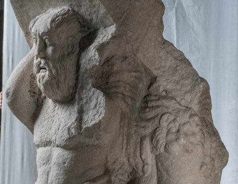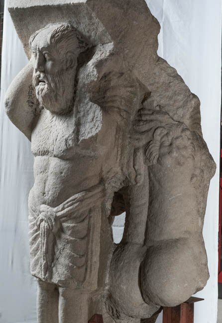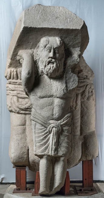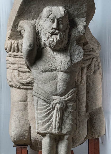 Auf der Rückseite mythische Figur (Atlas) : stehender bärtiger Mann mit um die Hüften geschlungenem und vorn verknotetem Lendenschurz, beide Arme nach vorn abgewinkelt erhoben. Überarbeitung des 12./13. Jhs.