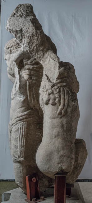 - Beine und Arme der Figuren tlw. abgebr., Rand der Sonnenuhr verbr., rückwärt. Figur mittelalterl. überarbeitet