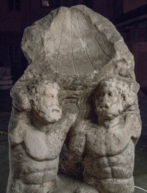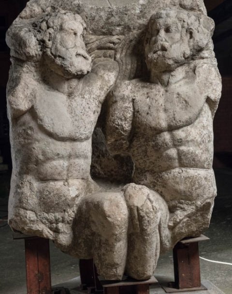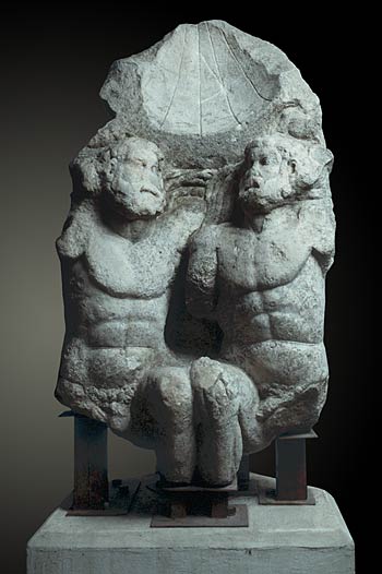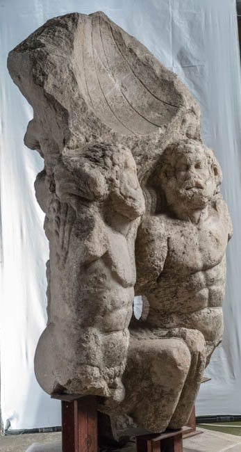 Auf der Vorderseite mythische Figur (Hercules, Atlas ?) : zwei nebeneinander kniende nackte Männer, bärtig, kurzgelocktes Haar, der linke mit Löwenfell, dier rechte mit Mantel auf der äußeren Schulter. Beide haben den jeweils äußeren Arm stützend erhoben, die linke Figur schlingt den linken Arm um die Schultern der anderen, diese stützt die rechte Hand auf ihr rechtes Knie. Am unteren Rand der Sonnenuhr rechts noch männliche Büste erkennbar (Sol ?), das Pendant links fast ganz weggebrochen.