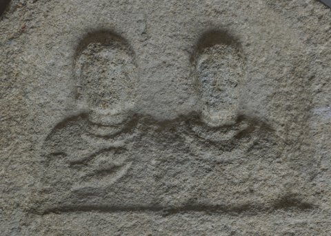 - Unter offenem Giebel zwei Brustbilder (Ehepaar). Links Frau mit Apfel in der Rechten. Rechts bärtiger Mann.
