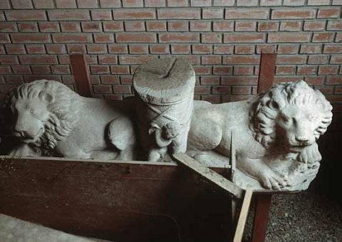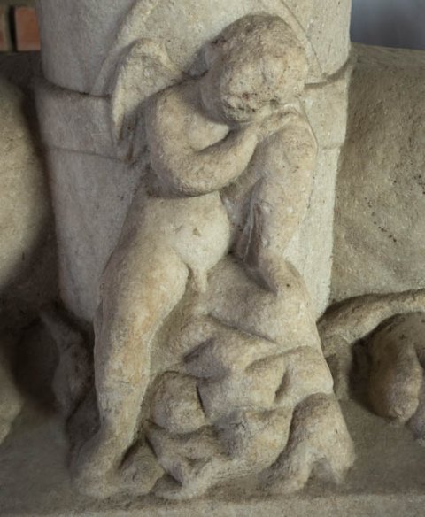 - Zwischen liegenden Löwen mit Widderköpfen in den Pranken zylindrische Ciste, davor auf gesenkte Fackel gelehnter Trauergenius neben einem Tumulus (?).