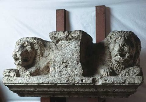 - Auf profiliertem Gesims liegende Löwen mit Widderkopf in den Pranken, zwischen ihnen Altar.