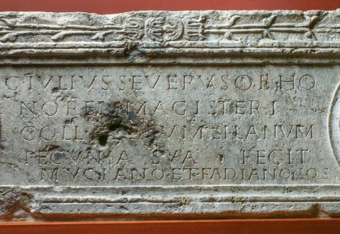 - C(aius) Iulius Severus ob ho/norem magisteri(i) / coll(egii) fabrum silanum / pecunia sua fecit / Muciano et Fadiano (!) co(n)s(ulibus)