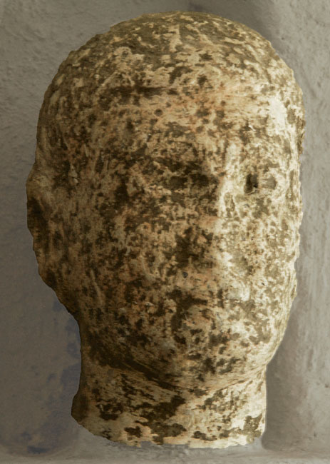 Der etwa lebensgroße Kopf stammt von einer Statue, über deren ursprünglichen Standort wir leider nichts wissen. Das heidnische Heiligtum, das einst hier existiert haben soll, ist doch etwas sagenhaft. Die heutige Aufstellung an der Johanneskapelle ruft eher die Assoziation mit dem auf dem Teller servierten Haupt des Heiligen hervor.