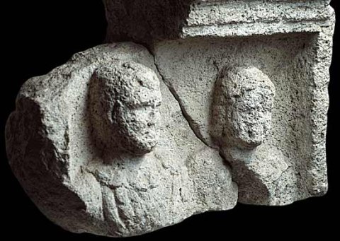 Im Hauptbild zwei Brustbilder (Ehepaar): links Mann, bärtig, Sagum, Fibel. Rechts Frau mit gescheiteltem gewellten Haar. Grabaltar ?