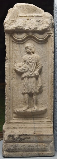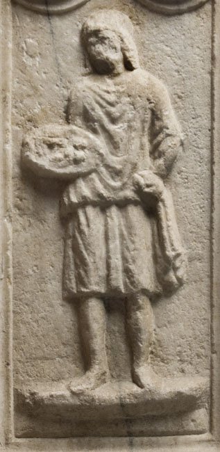 Auf der rechten Nebenseite Diener: unter geschwungener Rahmenleiste steht auf niedrigem Podest Mann in kurzer Tunica, in der Rechten Platte mit Speisen, in der Linken Tuch (mappa). - Inschrift