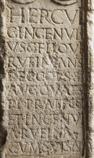 - Idib(us) Aug(ustis) // Herculi / C(aius) Ingenui/us C(ai) fil(ius) Quir(ina) / Rufinianus / dec(urio) col(oniae) S(eptimiae) S(iscianorum) / Aug(ustae) quaest(or) / r(ei) p(ublicae) praef(ectus) c(ollegii) c(entonariorum) / et Ingenui/a Rufina / cum suis d(ederunt) d(edicaverunt)