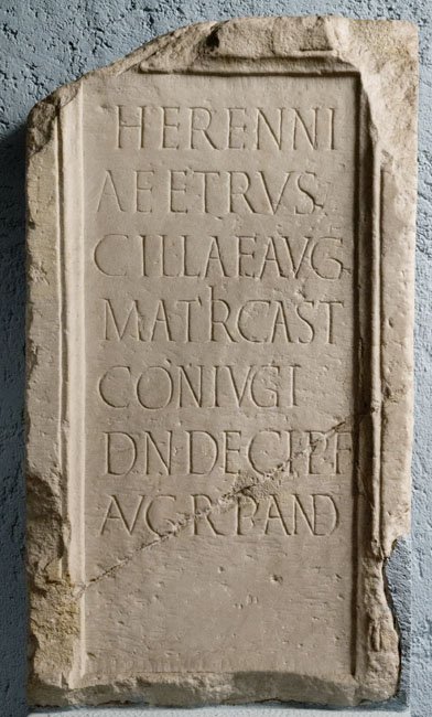 - Herenni/ae Etrus/cillae Aug(ustae) / matri cast(rorum) / coniugi / d(omini) n(ostri) Deci p(ii) f(elicis) / Augusti r(es) p(ublica) And(autoniensium)