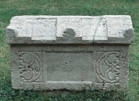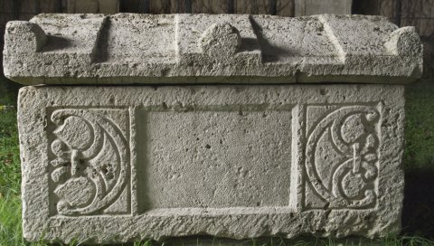 - Auf der Frontseite eingetieftes leeres Schriftfeld zwischen Rechteckfeldern mit Pelten.