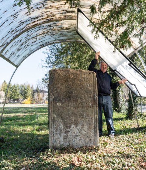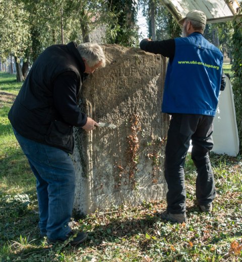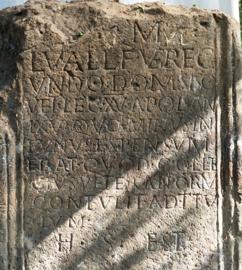 - D(is) M(anibus) / L(ucio) Val(erio) L(uci) f(ilio) Verec/undo domo Sisc(ia) / vet(erano) leg(ionis) XV Apol(linaris) an(norum) / LXV quo minus in / funus expensum / erat quod colle/gius(!) veteranorum / contulit ad titu/lum / h(ic) s(itus) est