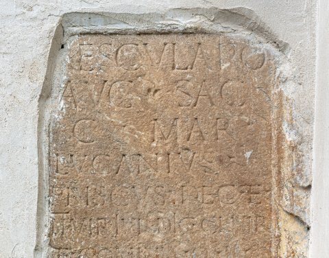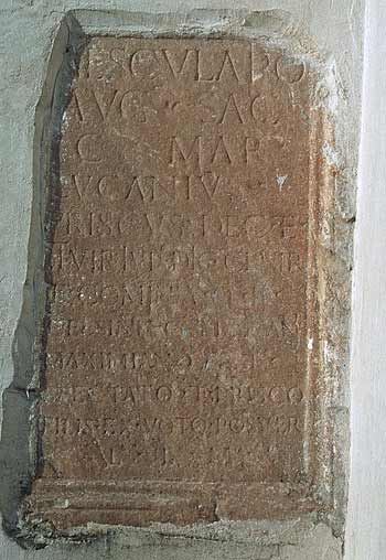- Aesculapio / Aug(usto) sac(rum) / C(aius) Mar(ius) / Lucanius / Priscus dec(urio) et / II vir iur(e) dic(undo) Cl(audio) Vir(uno) / et Cominia Q(uinti) f(ilia) / Celsinia cum Lucaniis / Maximiano Avet(o) / Spectato et Prisco / fili(i)s ex voto posuer(unt) / l(aeti) l(ibentes) m(erito)