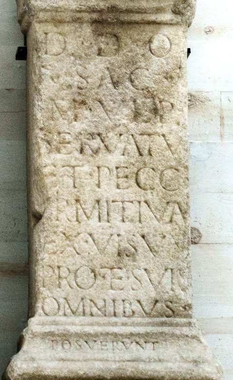 - D(is) d(eabusque) o(mnibus) / sac(rum) / M(arcus) Ulp(ius) / Servatus / et Pecci(a) / Primitiva / ex visu / pro (se) et suis / omnibus / posuerunt