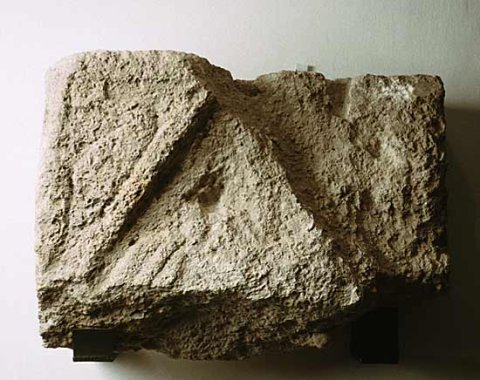 - Giebel eingeschrieben, auf den Schrägen Delphine, unten offen. Im Giebelfeld Rest der Büste eines Mannes: Sagum, Scheibenfibel. Schriftfeld mit profiliertem Rahmen.