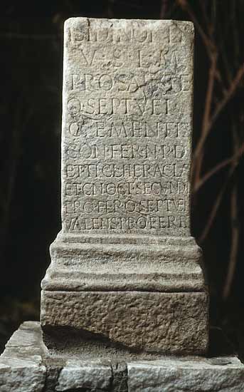 - Isidi Norei(ae) / v(otum) s(olvit) l(ibens) m(erito) / pro salute / Q(uinti) Septuei / Clementis / con(ductoris) fer(rariarum) N(oricarum) p(artis?) d(imidiae?) / et Ti(berii) Cl(audii) Heraclae / et Cn(aei) Octa(vii) Secundi / pro(curatorum) fer(rariarum) Q(uintus) Septueius / Valens pro(curator) ferr(ariarum)