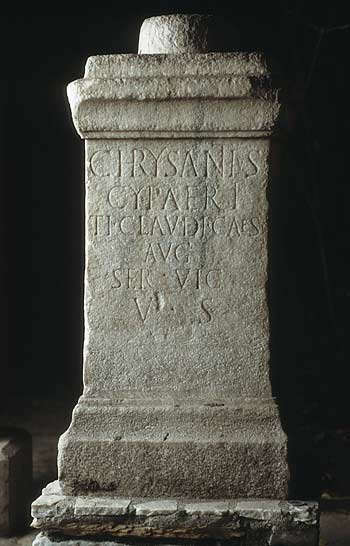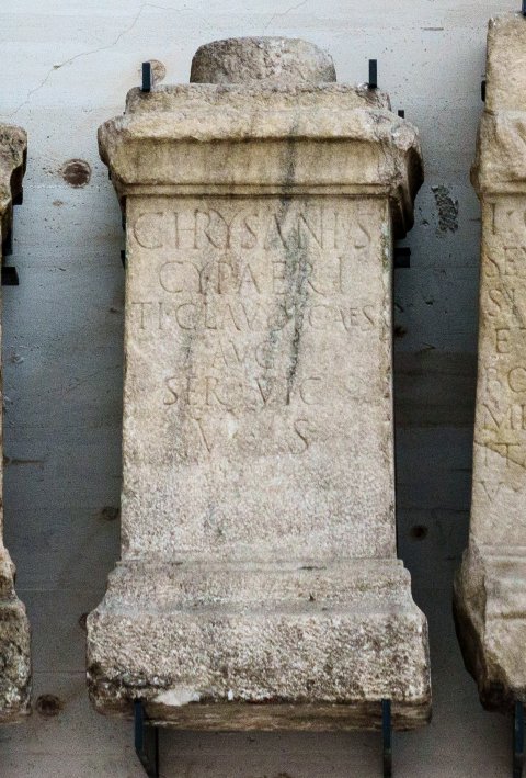 - Nor(eiae) / Chrysanthus / Cypaeri / Ti(berii) Claudi(i) Caes(aris) / Aug(usti) / ser(vi) vic(arius) / v(otum) s(olvit)