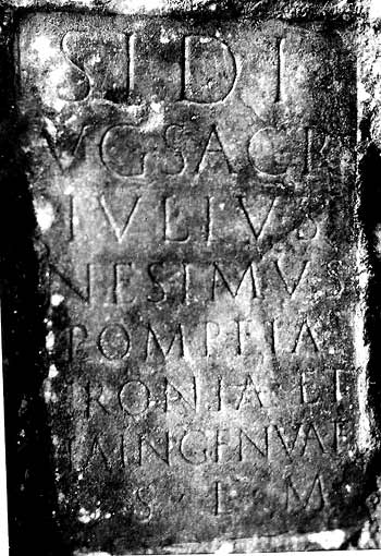 - Isidi / Aug(ustae) sacr(um) / [C(aius)] Iulius / [O]nesimus / [et] Pompeia / [E]cronia(?) et / [Iul]ia Ingenua f(ilia) / v(otum) s(olverunt) l(ibentes) m(erito)
