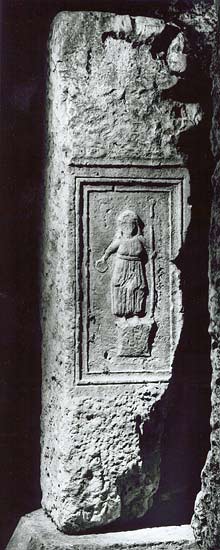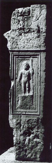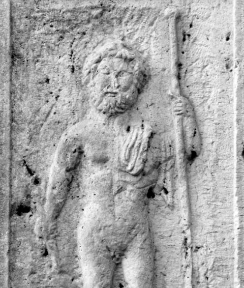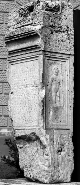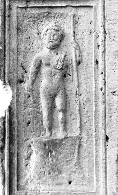 Auf den Schaft-Nebenseiten mythische Figur. Links Juno : in Rechteckfeld stehende Frau auf hohem Podest. Gegürteter Peplos, über den Kopf gezogener Schleier, in der Rechten Schale (patera), in der Linken Szepter. Rechts Jupiter : in Rechteckfeld stehende nackte Figur auf hohem Podest. In der Rechten Blitzbündel, in der Linken Szepter, über der linken Schulter Mantel. - Inschrift