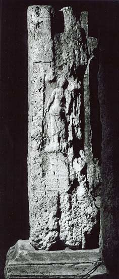 Rechts Victoria : vertieftes Relieffeld, oben Bogen mit Volutenenden. Auf hohem Podest stehende Frau im hochgegürteten Chiton, im linken Arm Palmzweig, in der erhobenen Rechten Kranz. - Inschrift