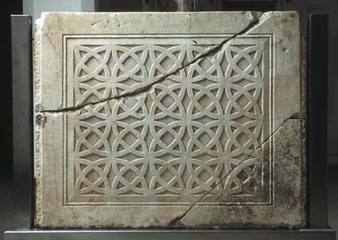 Auf der Rückseite Ornament aus sich überschneidenden Kreisen in gerahmtem Rechteckfeld.