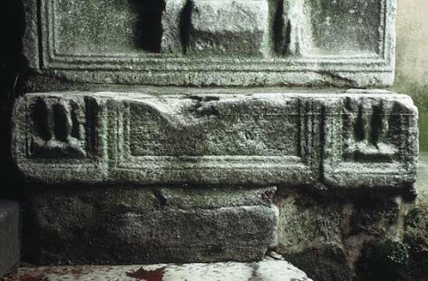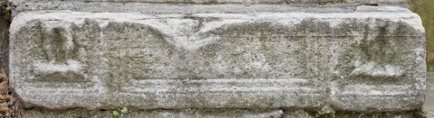 - Gerahmtes Schriftfeld zwischen Seitenfeldern. Auf flachem Podest stehende Figuren mit gesenkter Fackel (Trauergenius).