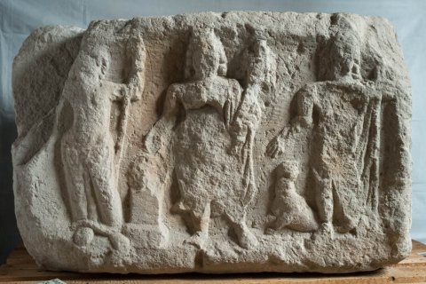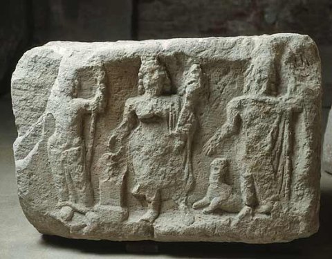 - Mythische Figur (Ariadne, Genius, Dionysos-Bacchus): Auf der Rückseite eines Blockes mit Bauinschrift einfach gerahmtes Rechteckfeld. In der Mitte jugendlicher Genius mit langen Locken und Mauerkrone, Mantel um Hüften und linken Arm, in der Linken großes Füllhorn, in der Rechten Opferschale (patera), die er über einen Altar ausgießt. Links Ariadne mit Mantel um den Unterkörper, in der erhobenen Linken Thyrsosstab. Rechts Dionysos-Bacchus mit Locken, Mantel um Unterkörper und erhobenen linken Arm, die Rechte zu einem liegenden Panther gesenkt.