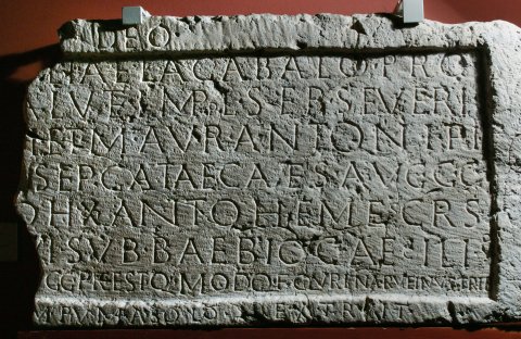 - Deo // [So]li Aelagabalo pro / [s]alute Impp(eratorum) L(ucii) Sept(imii) Severi / [Pi]i et M(arci) Aur(elii) Antoni(ni) Pii e/[t C(ai)] Sept(imii) Gatae (!) Caes(aris) Auggg(ustorum) / [ c]oh(ors) (milliaria) Anto(nina) Hemes(enorum) c(ivium) R(omanorum) s(agittaria) / [q]ui sub Baebio Caeciliano / [ leg(ato) A]ugg(ustorum) pr(a)eest Q(intus) Mod(ius) Q(uinti) f(ilius) Quirina Rueinus (! Rufinus) trib(unus) // [ te]mplum a solo extru(x)it