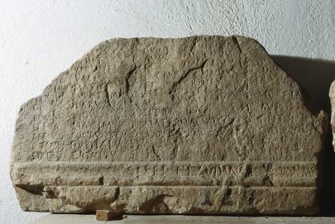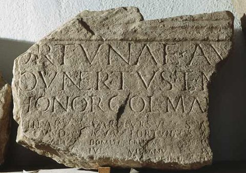 [F]ortunae Au[g(ustae) sacrum] / [Fl(avius) C]ovnertus et N[on(ius) ---] / [in] honor(em) col(legii) Man[liensium tit(ulum) d(onum) d(ederunt)] // [---] Hilarus / [--- Se]cundi / [---]talis / [---s / [--- // Var(ius) Ursus / N(a)evius Fortunatus / Domiti(us) Primus / Iul(ius) Vibianus / Iul(ius) Secundinus / [---]d (ius) Calendini / [--- In]genuus / [---]unus / [--- // Au[l(us) ---] / A[---] / Iu[l(ius) ---] / Iu[l(ius) ---] / I[---] / P[--- //