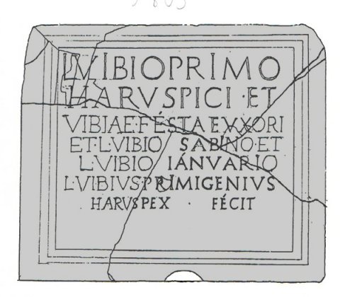 - L(ucio) Vibio Primo / [h]aruspici et / [ --- F]estae ux[ori] / [et L(ucio) Vibio] Sabi[no et] / [L(ucio) Vibio] Ianuari[o] / [L(ucius) Vibius] Primigenius / [haru]spex fecit